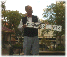 again brandishing his "November 6th, 1934" sign, with the determination of a